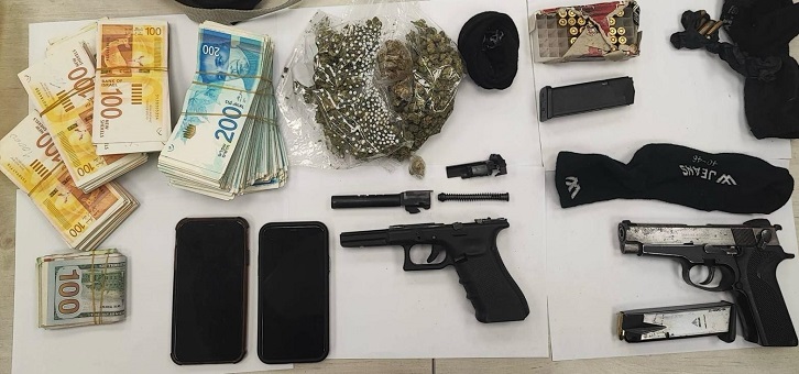 במסגרת חיפוש חשפו השוטרים שני אקדחים, תחמושת, מחסניות, חומר חשוד כסם מסוג קנאביס במשקל של עשרות גרמים וכסף מזומן בשווי עשרות אלפי שקלים במזומן, מוסלקים במקום.