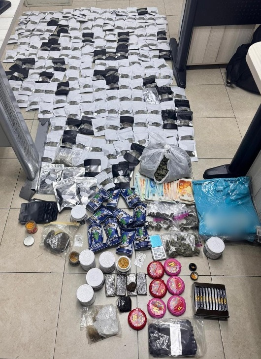 במסגרת החיפוש הבלשים איתרו ותפסו שקיות חלוקה רבות של חומרים החשודים כסם מסוגים שונים: