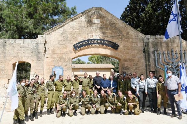 הנשיא הרצוג ושר הביטחון גנץ בצילום קבוצתי עם החיילים בחוות השומר של חיל החינוך