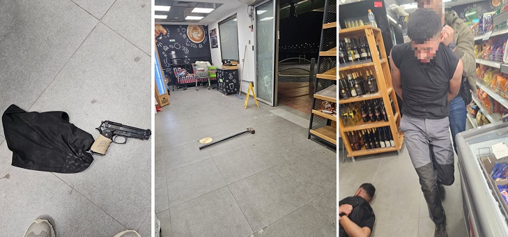 מעצר החשודים, זירת השוד ואקדח שנתפס (צילומים: משטרה)