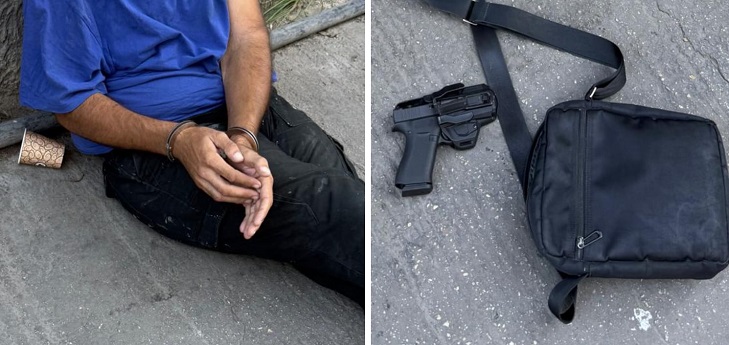 האקדח שנתפס והחשוד לאחר שנעצר (צילומים: דוברות המשטרה)