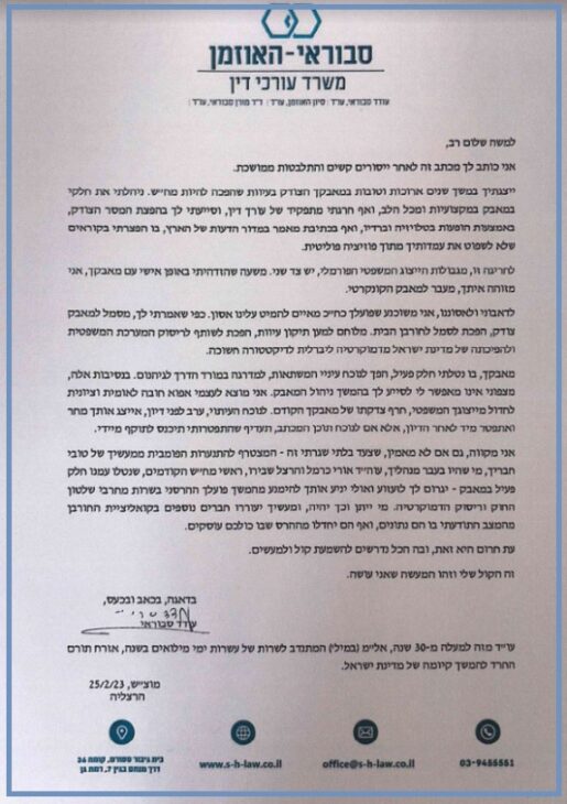 סבוראי חתם: "בדאגה, בכאב ובכעס, עו"ד מזה למעלה מ-30 שנה, אל"מ במיל' המתנדב לשרות של עשרות ימי מילואים בשנה, אזרח תורם החרד להמשך קיומה של מדינת ישראל".