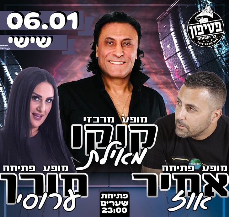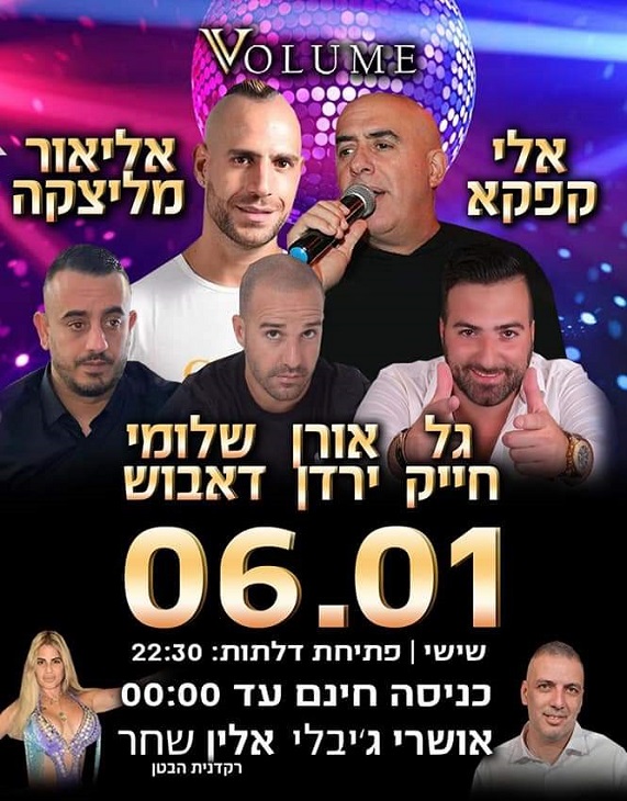 הזמרים אלי קפקא, אליאור מליצקה, גל חייק, אורן ירדן ושלומי דאבוש. רקדנית בטן: אלין שחר. שישי, 6.1, פתיחת דלתות: 22:30. כניסה חינם: עד 24:00. מועדון Volume, דרך המכבים 16, ראשון לציון.
