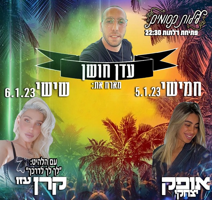 עדן חושן מארח את הזמרת אופק יצחקי, חמישי, 5.1, והזמרת קרן עזוז, עם הלהיט "לך לך לדרכך", שישי, 6.1. פתיחת דלתות: 22:30. מועדון לילות קסומים, דרך הים 7, אילת.