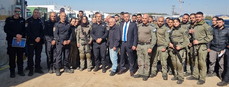 מפכ"ל המשטרה לוי, השר כץ ועו"ד כחלון יחד עם הכוחות שפעלו בשטח (צילום: דוברות המשטרה)