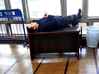 דורון הרמן, כתב חדשות 10 וחושף פרשת השופטת המשבשת רונית פוזנננסקי כץ, בהפוגה מאחד הדיונים בתיק 4000.
