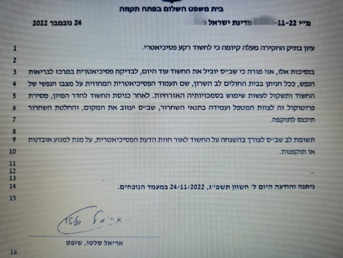 אז הוא נעצר בחשד כי פרץ, בשתי הזדמנויות למשרדי הנהלת החשבונות בקיבוץ מעברות, גרם במקום וגנב רכוש. אז הוא הובא לבית משפט. כבר בדיון הזה, נציג המשטרה בעצמו הצהיר כי לחשוד עבר פסיכיאטרי. בדיון זה ציין סנגורו, עו"ד עידו רז, כי החשוד מוכר לקיבוץ ולמחלקת הרווחה. לדבריו, מדובר באדם עם צרכים מיוחדים שהקיבוץ תומך בו ומסייע לו. בתום דיון זה, השופט אריאל סלטו, הורה על שחרורו ללא מעצר בית, תוך שציין כי עיון בתיק החקירה מעלה כי לחשוד רקע פסיכיאטרי. בעקבות כך, הורה השופט לשב"ס כי החשוד יועבר עוד באותו יום לבדיקה פסיכיאטרית במרכז לבריאות הנפש.