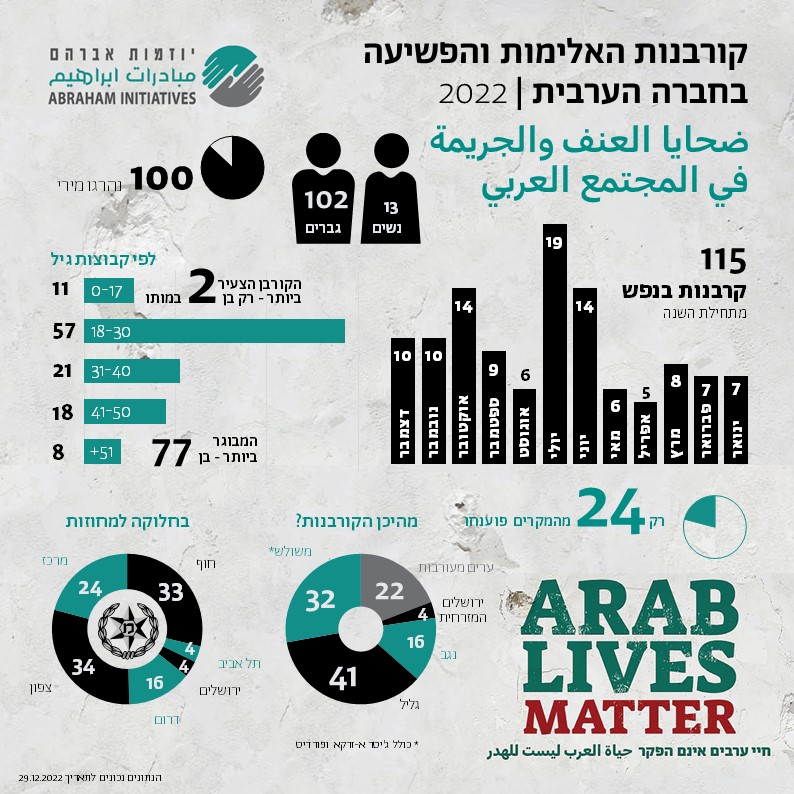 116 קורבנות קיפחו את חייהם בנסיבות הקשורות לאלימות ופשיעה בחברה הערבית בשנת 2022.