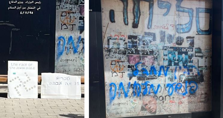 ת"א: נעצר חשוד בריסוס "רבין מחבל" על האנדרטה לזכרו ביום השואה