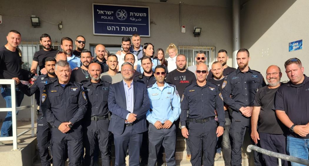 השר לביטחון לאומי בן גביר עם שוטרי תחנת רהט (צילום: דוברות המשרד לביטחון לאומי)