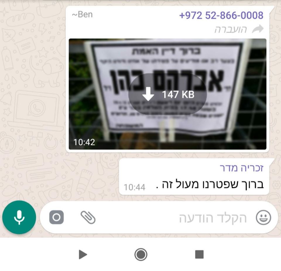 באחד הפוסטים שבה פורסמה מודעת אבל לזכרו של אבי כהן הוא כתב על התמונה של המנוח, שהתלונן עליו כאמור, "ברך שפטרנו".