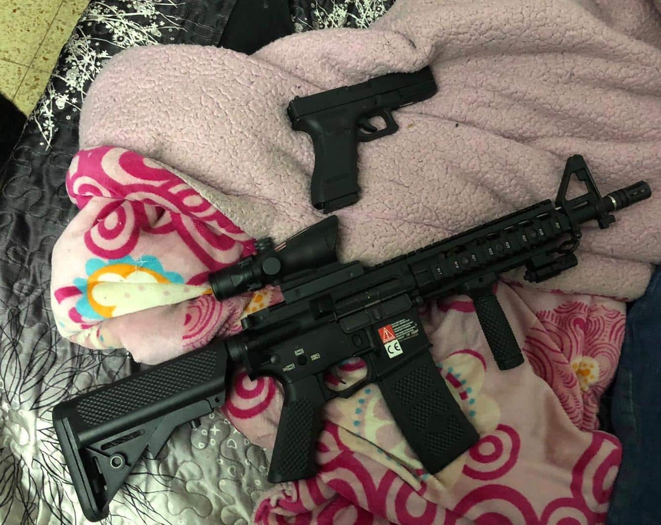 בחניון, כך נטען, השניים ניגשו לרכב חונה עם לוחיות רישוי של רכב גנוב. התביעה טוענת כי אלגרבלי, שהיה פסול נהיגה, נכנס לרכב ואילו כהן חזר להאופנוע עם התיק. סמוך לאחר מכן נסעו השניים מהמקום ולפי האישום הגיעו לרחוב הירמוך ביבנה. בהמשך נסעו השניים לאשדוד, ונעצרו על ידי שוטרי ימ"ר לכיש. בחיפוש ברכב אותרו רובה אוויר שעליו הותקנה כוונת והוא הוסב להיות רובה M16 שמסוגל לירות כדורים 5.56 מ"מ, שתי מחסניות תואמות לרובה שהכילו 55 כדורים, אקדח חצי אוטומטי שנגנב מבית בחודש מאי והיה שייך לעיריית מעלות תרשיחא, מחסנית ו-16 כדורים תואמים.