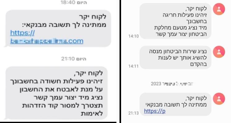 בשלב שני– לקוחות שנפלו בתרמית והזינו את פרטי הכניסה לחשבונות המקוונים של הבנק, קבלו הודעה נוספת על פעילות חריגה בחשבונותיהם וכי ייצור עמם קשר נציג הבנק.