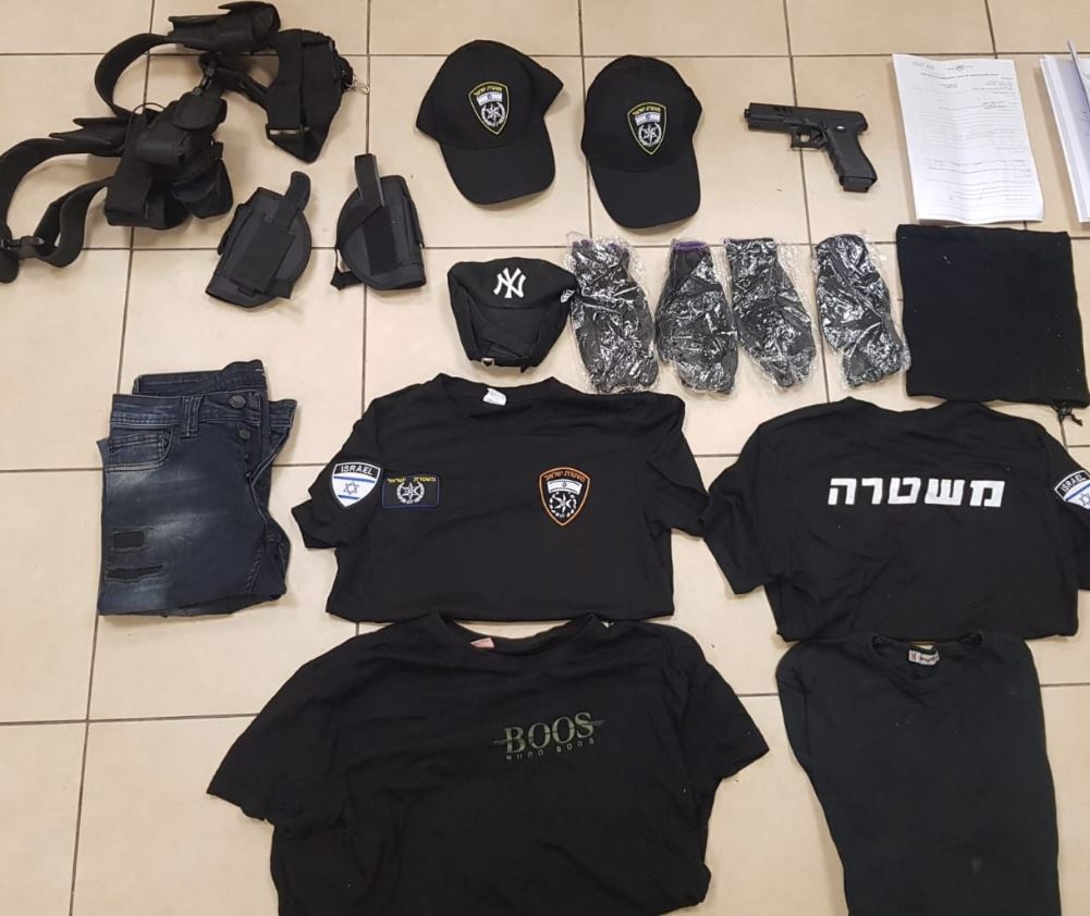בתא המטען אותרו שני כובעי משטרה ושתי חולצות עם הכיתוב משטרה עם סמל משטרתי. כמו כן, נמצאו כפפות שחורות ונתרתיקי אקדחים.