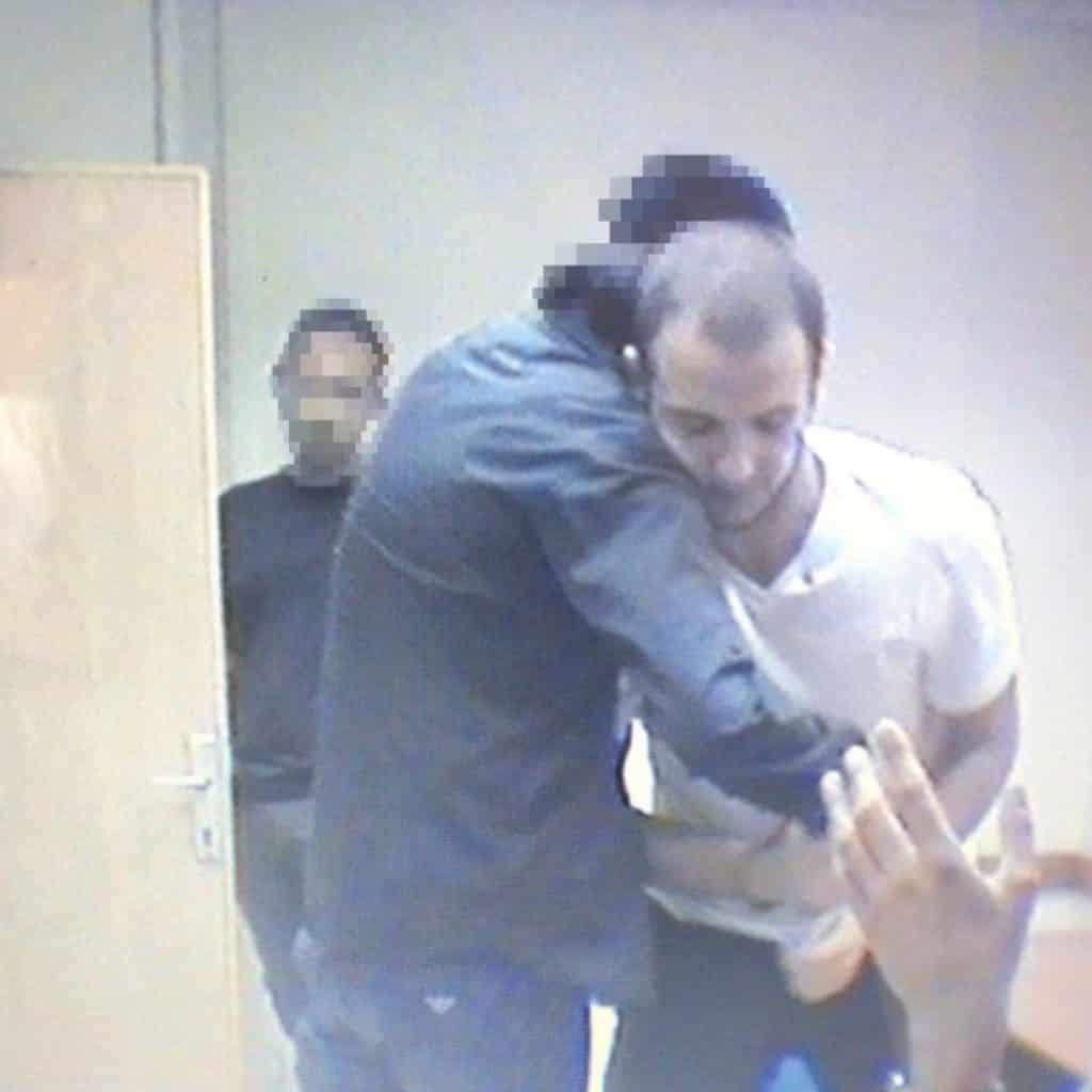 עד המדינה מחבק את יבגני גולובקו לאחר ששכנע אותו להודות ברצח, הודאה שנפסלה