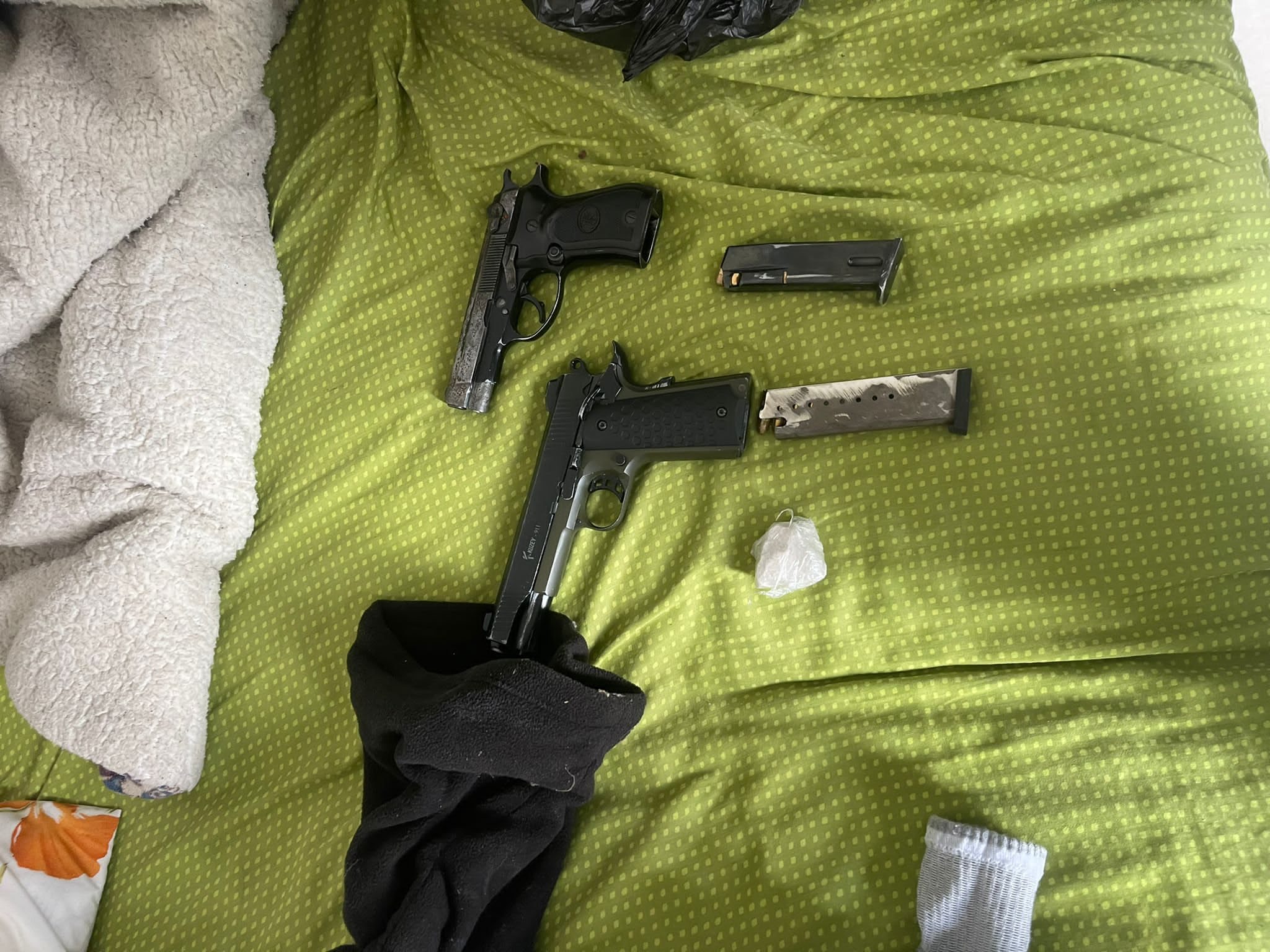 בחיפוש שערכו השוטרים בביתו, נתפסו שני אקדחים טעונים בתחמושת וסם מסוג 'קריסטל' במשקל 34 גרם.