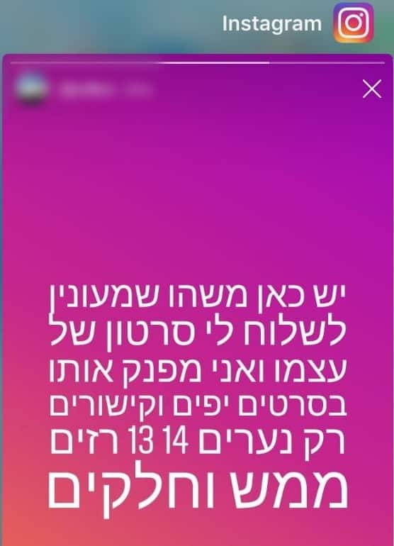 "יש כאן מישהו שמעוניין לשלוח לי סרטון של עצמו ואני מפנק אותו בסרטים יפים וקישורים רק בני 14-13 רזים וממש חלקים".