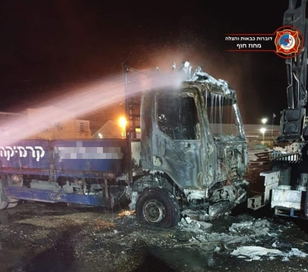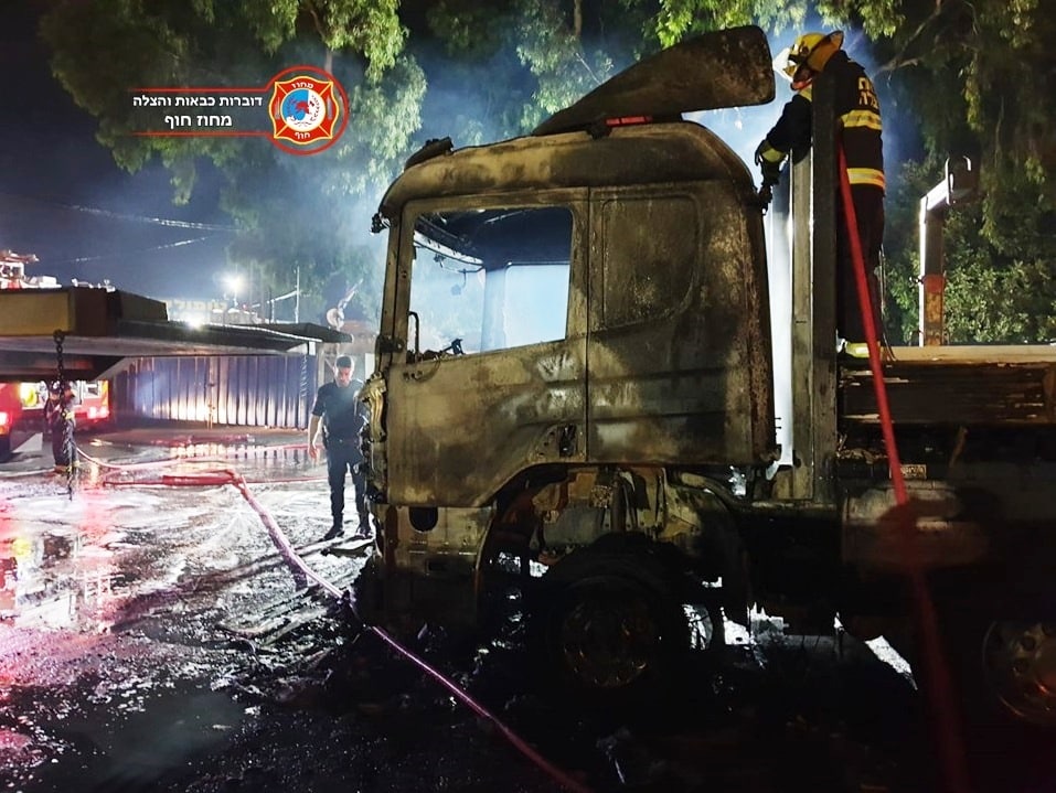 אחת המשאיות שהוצתו (צילום: דוברות כב"ה מחוז חוף)