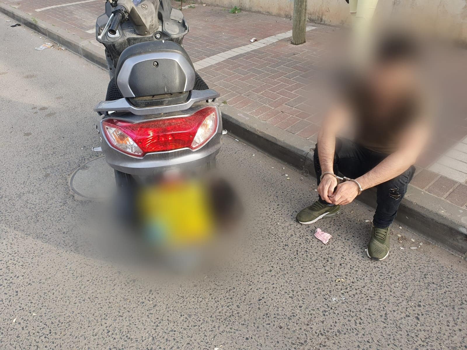 רוכב, תושב פתח תקווה, נעצר, והאישה בת ה-20 שרכבה מאחוריו עוכבה לחקירה. שניהם נחשדים באחזקת חומר החשוד כסם שלא לצריכה עצמית. הקטנוע נתפס על ידי המשטרה ויחל הליך חילוט לגביו. בתום החקירה, שוחררו שניהם למעצר בית של חמישה ימים, בתנאים מגבילים.
