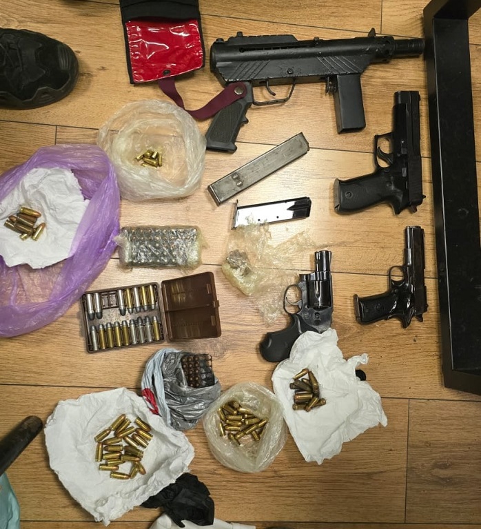 חומר החשוד כקוקאין, אקדחים, רובה, רימוני הלם ורסס, תחמושת, לבנות חבלה וכ-80 אלף שקלים במזומן.