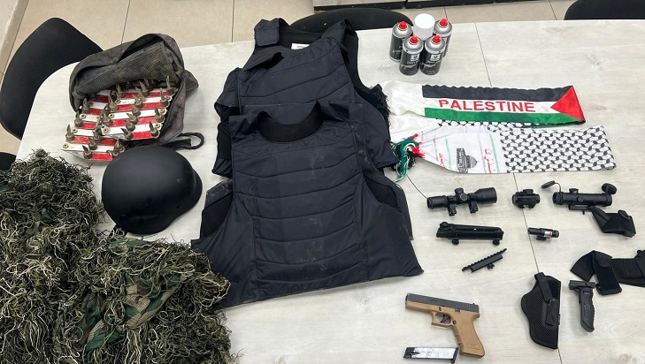 השוטרים תפסו מחסניות, תחמושת, קסדות, אפודים קרמיים, כוונות לרובים, אקדח איירסופט, צעיפי אש"ף, ערכה לפריסת דוקרנים נגד גלגלי כלי רכב, ועוד פריטי לחימה.
