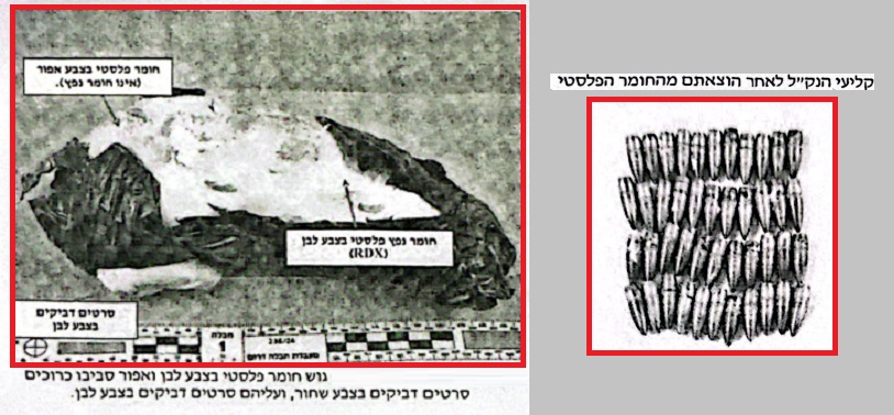 מכתב האישום המקורי עלה, כי חומר הנפץ במטען הורכב מחומר מרסק שהיה מעורב עם חומר פלסטי ולתוכו הוטבעו 44 קליעים שהיוו חלק מהרסס. עוד כלל המטען ברגים, אומים וכדוריות מתכת.