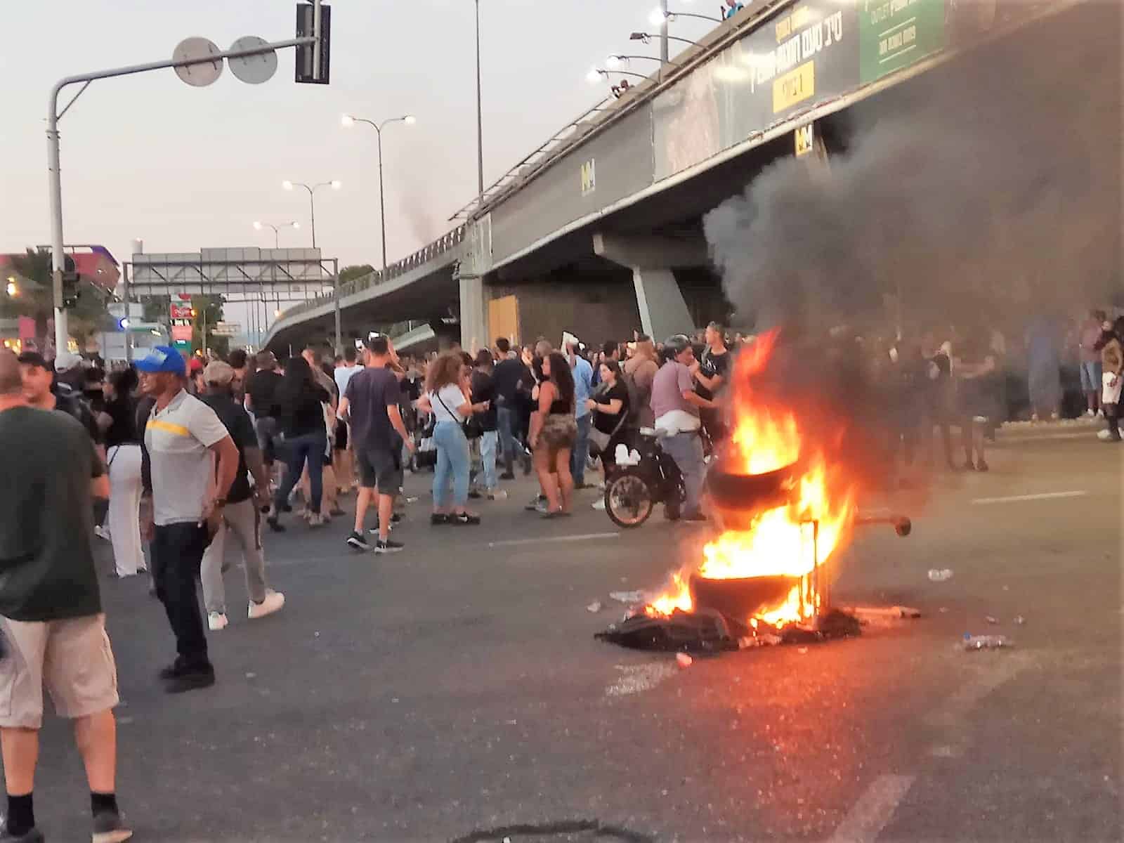 המפגינים מתרכזים מתחת לגשר ומציתים צמיגים (צילום: איחוד הצלה)