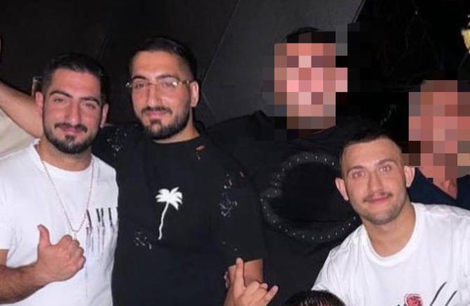"ארגון פשע נולד". האחים דין (מימין) ושון קסנטיני עם החבר ברוך בורוכוב שנרצח. עשרות חברים המתינו בבית המשפט