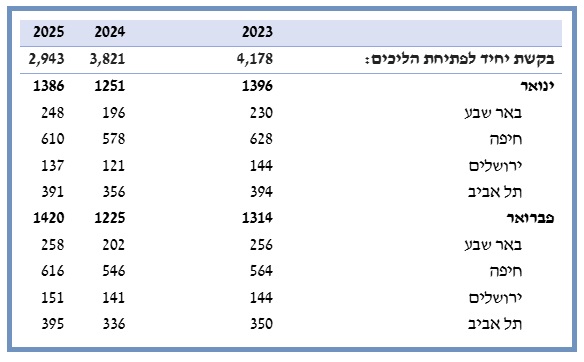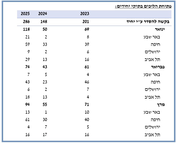 יחד עם האמור, נצפתה עלייה בשיעור של כ-93 אחוז בבקשות להסדרים שמגישים יחידים (286 בקשות לעומת 148 ברבעון המקביל בשנת 2024).