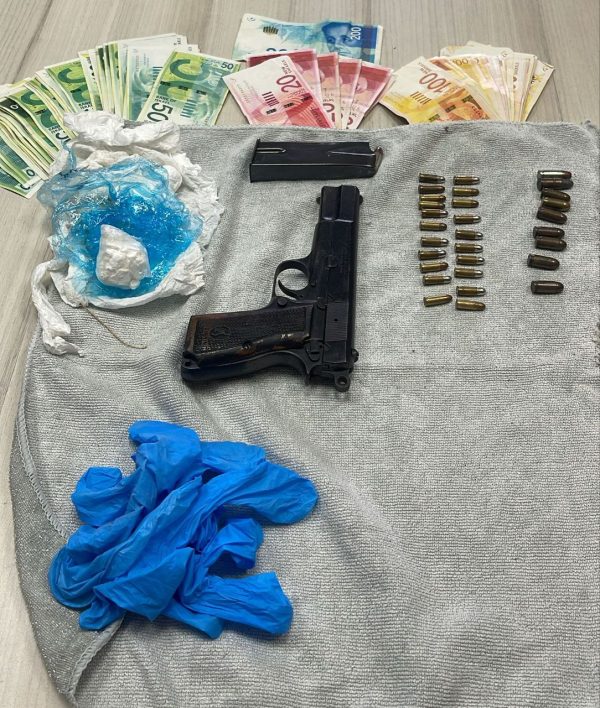 במהלך החיפוש תפסו השוטרים אקדח 9 מ"מ מסוג "בראון" כשהוא טעון, מחסנית עם כדורי 9 מ"מ ו- 21 כדורי אקדח של 0.22 מ"מ. כמו כן, נתפסו במהלך החיפוש רימון הלם, 20 גרם סם מסוג קוקאין, 5,000 שקל במזומן ושישה טלפונים ניידים.