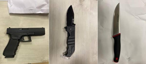 האקדח והסכינים שנתפסו בדירת המסתור (צילומים: משטרה)