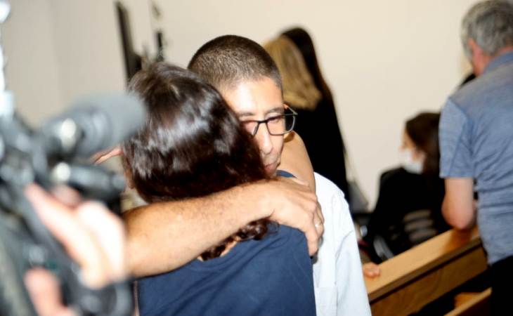 רמי יוגב בזרועות בנו משפחתו, המום אחרי הכרעת הדין (צילום: מוטי קמחי)