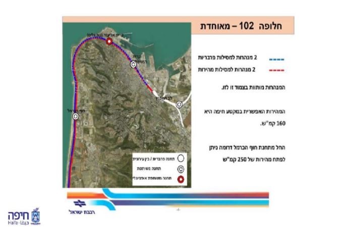 על פי התכנית, יוכפל מספר מסילת הרכבת בקטע שבין שפיים למרכזית המפרץ, כך ששתי מסילות ישמשו את הרכבת הפרברית ושתיים נוספות תהיינה מיועדות לרכבות מהירות, אשר יוכלו להגיע למהירות של 250 קמ"ש ויקצרו באופן משמעותי את זמן הנסיעה בין מטרופולין חיפה למרכז הארץ. כל ארבע המסילות יעברו כאמור במנהרה לאורך רצועת החוף של חיפה – מאיזור גשר פז ועד לתחנת חוף הכרמל.