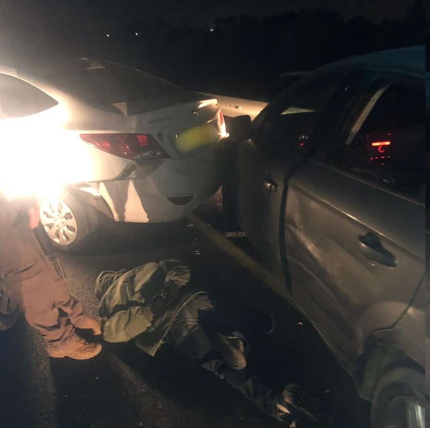 באותה עת, שוטרי ימ"ר צפון ביצעו חסימה משטרתית יזומה בכביש. סמוך להגעת הנאשמים לחסימה, סטה מוחמד שנהג ברכב לשול הדרך, לתוך מטע זיתים שנמצא בקרבת אתר העבודות. התביעה טוענת כי כאשר הבחינו הנאשמים במשטרה, גאלי וראמי נמלטו מהרכב כשאחד מהם נטל עמו את האקדח והשליך אותו בנתיב הבריחה, ואילו מוחמד נעצר בתוך הרכב. במהלך חיפושים באזור, בסיוע מסוק, אותר ראמי מסתתר על עץ במטע זיתים. גאלי הצליח להימלט ונעצר בהמשך.