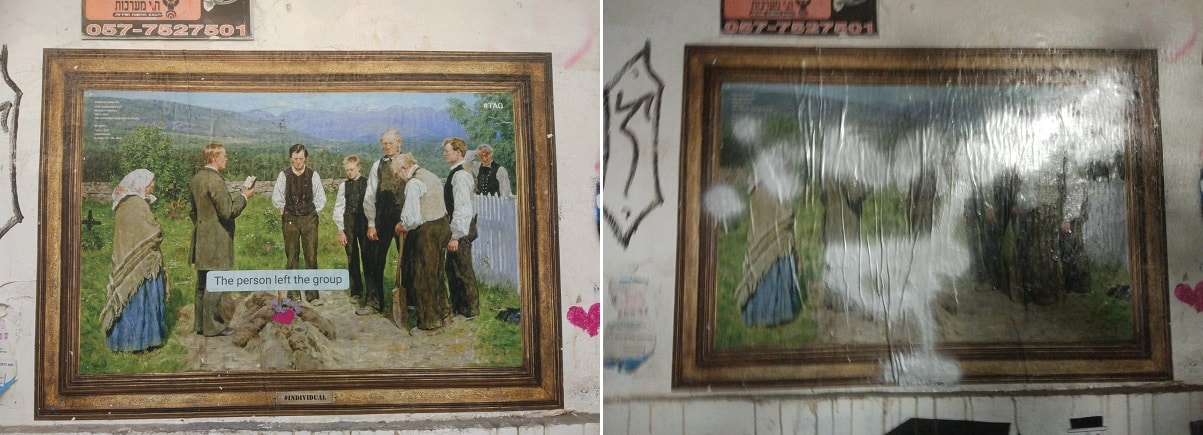 הציורים של #טאג הושחתו בלילה שבין שלישי לרביעי (5-6.11). לדברי שגב, באחד הסיורים ניגש אליה דייר הרחוב ואמר שהסיור מפריע, מאחר שהאקוסטיקה ברחוב גרועה ורעש המבקרים מגיע לתוך הבית.