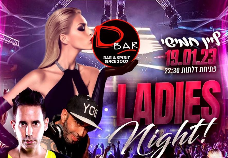 ליין חמישי – Ladies Night. פתיחת דלתות: 22:30. בעמדת הדי ג'ייז: Dj Yahel ,DJ ARBIV.