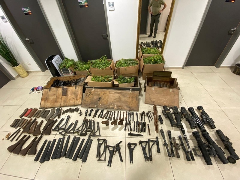 לאחר מעצרו של החשוד נכנסו השוטרים לדירה ואיתרו כ-45 ק"ג קנאביס בתהליך ייצור, "שלב אחד לפני מכירה והפצת הסם", כהגדרת המשטרה. כאן לא תם ונשלם הסיפור: השוטרים שהמשיכו בחיפוש הופתעו לגלות במחסן הדירה מאות פריטי אמל"ח, ביניהם 232 מחסניות של כלי נשק שונים, 17 כוונות, חמישה גופי נשקים, שמונה קנים ועוד עשרות חלקים המתאימים לכלי נשק שונים.