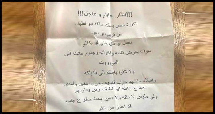 "לכל אדם שתומך במשפחת אבו לטיף מקרוב או רחוק, בעבודה או בכסף או אפילו בדיבור, הוא יחשוף את עצמו ואת כל משפחתו למוות, אל תשליכו את ידיכם לחורבן. המדינה תהיה עדה למלחמה אכזרית למשך שנים ולטווח רחוק על משפחת אבו לטיף וכל מי שיתמוך בהם. מי שאין לו צד בעניין, שיישב בצד ולא יתערב. ראו הוזהרתם".