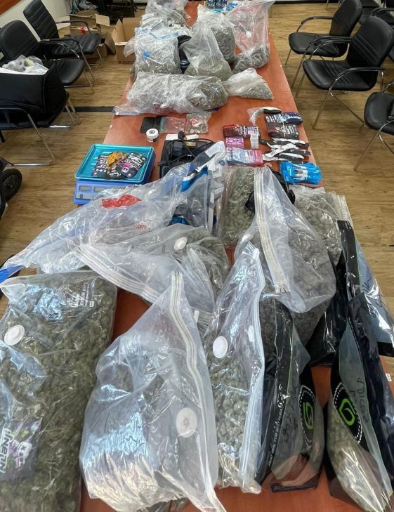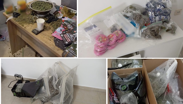 במהלך החיפוש בדירה המדוברת תפסו השוטרים מגוון רחב של חומרים החשודים כסמים מסוגים שונים, לפי הפירוט הבא: יותר מ-24 ק"ג קנאביס, יותר מקילוגרם חשיש, 52 סיגריות אלקטרוניות עם חומר החשוד כסם, 11 חבילות עוגיות קנאביס, 13 חבילות מסטיקים עם קנאביס, חמישה מזרקים עם שמן קנאביס, משחת קנאביס וקופסא עם חומר גבישי לבן. בנוסף, נתפסו מכונה לספירת שטרות ומשקל מסחרי.