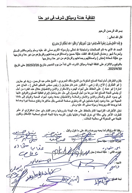 בהודעה שהוציאו הצדדים נכתב: "דיר חנא האהובה נושמת לרווחה לאחר חתימת הסכם ההפוגה ואמנת הכבוד". ההסכם נחתם בפני ועדת הפיוס והסולחה, המורכבת מהאישים הבאים: