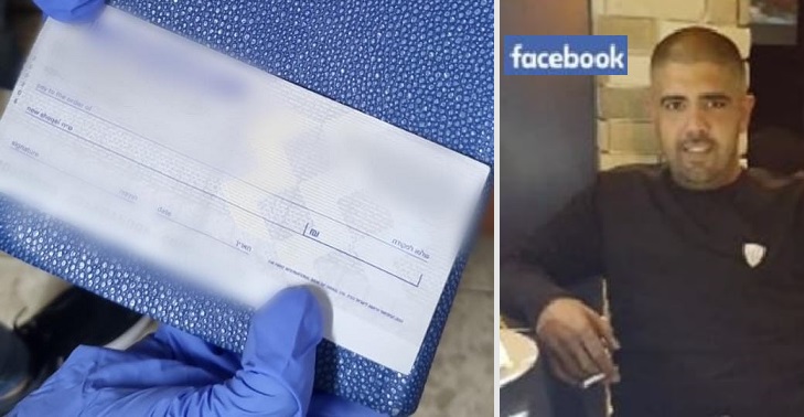 דניאל ימיני וצ'ק מזויף שנתפס (צילומים: רשתות חברתיות, דוברות המשטרה)