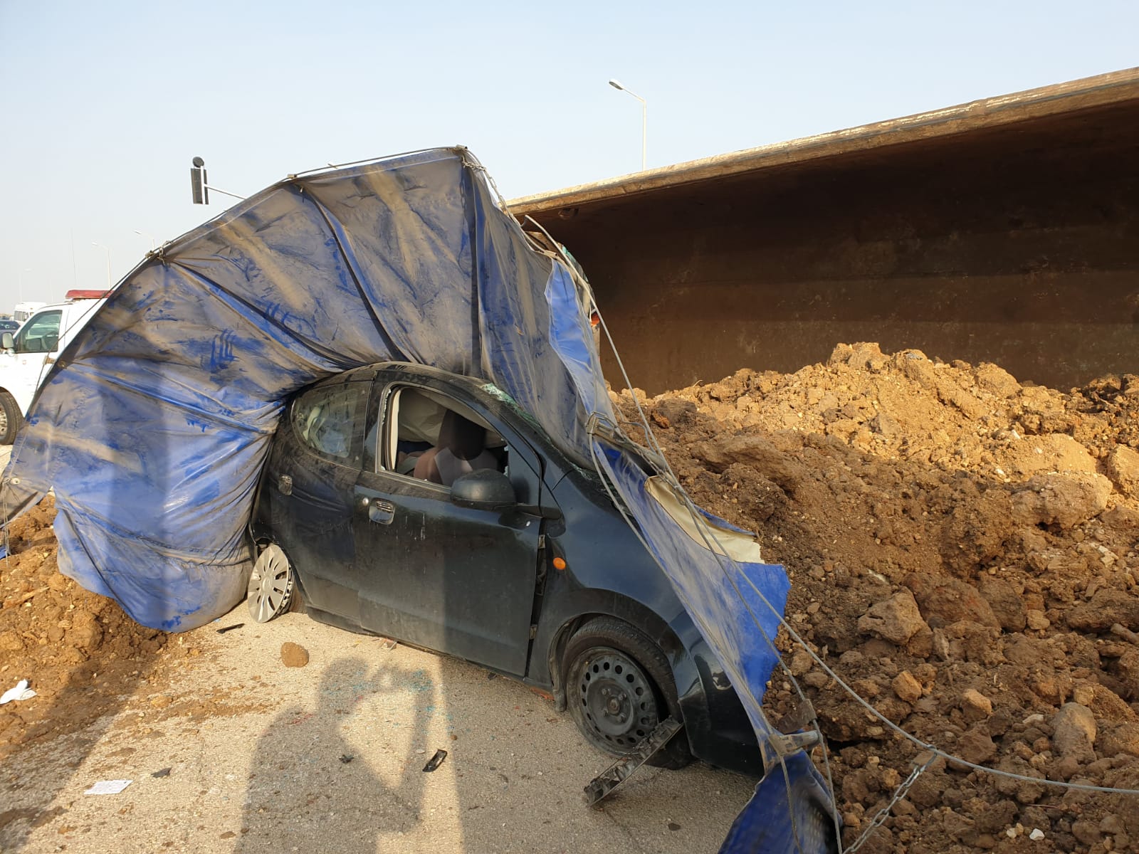 החול מהמשאית נשפך על רכב וכמעט שקבר אישה ושני ילדיה