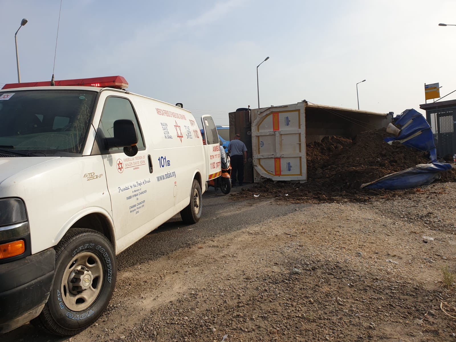 הבוקר (חמישי, 16.5) התקבל דיווח על משאית עפר שהתהפכה על צידה בכביש 4613, מצומת בדק לצומת ברקת. החול שהמשאית הובילה נשפך על רכב שחנה בשול הדרך. צוותי מד"א העניקו טיפול רפואי ופינו לבית החולים שיבא בתל השומר אישה כבת 28 ושני ילדים במצב קל, בהם פעוט כבן שנתיים ופעוטה כבת שנה.