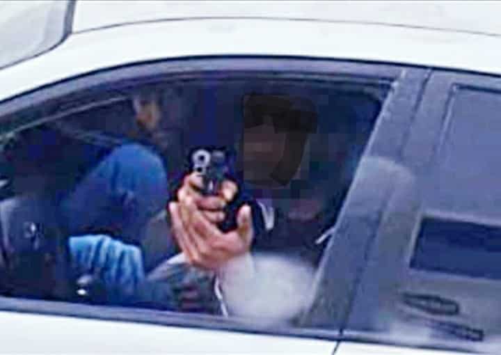התביעה מוסיפה וטוענת כי בהמשך הנסיעה איים הנאשם על יושבי המשאית בכך שאחז בחפץ הנחזה לאקדח וכיוון אותו לעברם באופן מאיים כשידו על ההדק. נהג המשאית המשיך בנסיעה, בעוד שהנאשם החל בנסיעה מהירה ופרועה, עקף את המשאית והסיט את ההגה כך שהרכב "זיגזג" בכביש. מהחקירה עולה כי הנאשם המשיך לאיים מחוץ לחלון עם החפץ שנראה כנשק ונופף בו באוויר. בכתב האישום נטען כי לאחר מכן המשיך הנאשם בנסיעתו כ-300 מטר נוספים ועצר את רכבו בדרך עפר. נהג המשאית המשיך בנסיעה במהירות של 85-95 קמ"ש. התביעה טוענת כי הנאשם וחברו ירדו מרכבם ונעמדו במרכז הכביש בנתיב נסיעת המשאית, כשהנאשם מחזיק בידו את החפץ ומכוון אותו לעבר יושבי המשאית. חברו של הנאשם נעמד סמוך לשול הכביש והחזיק אף הוא חפץ הנחזה להיות אקדח, וכיוון אותו אף הוא לעבר נוסעי המשאית.