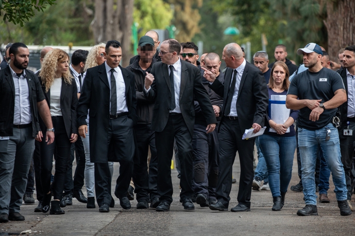 השופט פלאח ועו"ד יאיר נדשי בדרך לזירת האירוע, הנאשם באמצע, ונציג מח"ש מימין (צילום: פלאש 90)