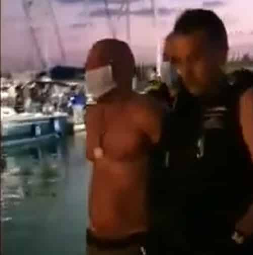 לטענת התביעה, מיד לאחר מכן הנאשם איבד שיווי משקל ונפל למים. השוטרים הודיעו לו שהוא עצור וניסו להיצמד ליאכטה, אך הנאשם שבינתיים עלה אליה בחזרה, התנגד למעצר וניגח את סירת השוטרים. בהמשך זרקו השוטרים חבל הצלה לכיוון מדף היאכטה כדי לעצור אותה, אך החבל נקרע מעוצמת המנוע.