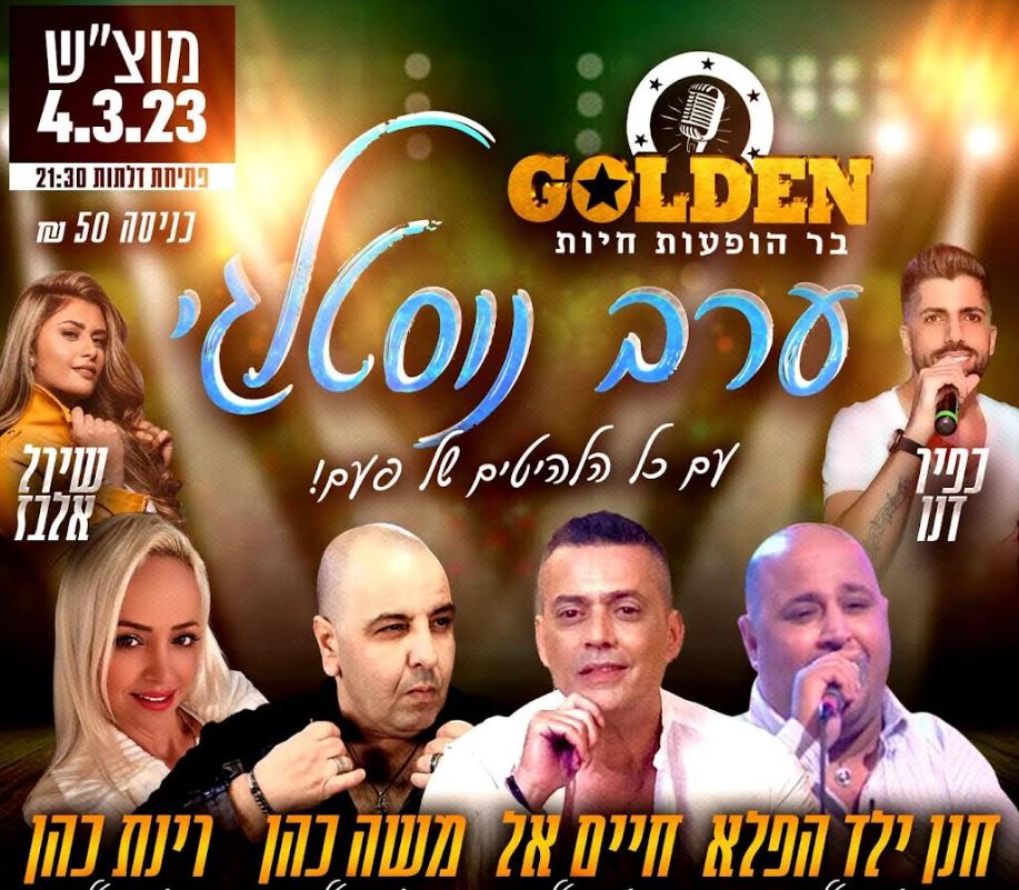 ערב נוסטלגיה עם כל הלהיטים של פעם. כפיר דנו, שירל אלבז, חנן ילד הפלא, חיים אל, משה כהן ורינת כהן. מוצ"ש, פתיחת דלתות: 21:30. גולדן, מנחם בגין 17, ת"א