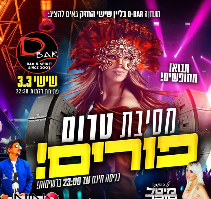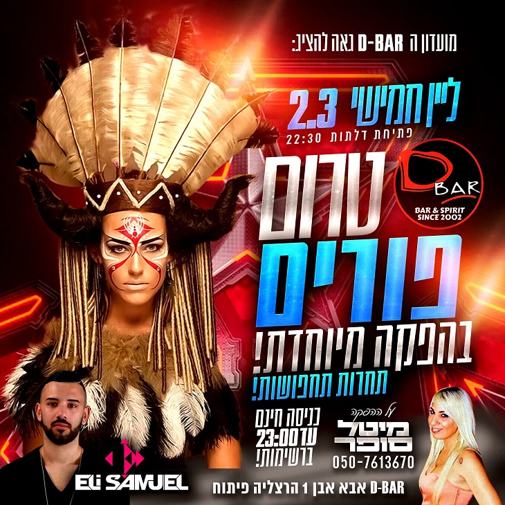 מסיבת טרום פורים ותחרות תחפושות. בעמדת הדי-ג'יי: DJ ELI SAMUEL. חמישי, 2.3, כניסה חינם: עד 23:00. מפיקה: מיטל סופר. D BAR. אבא אבן 1, הרצליה פיתוח
