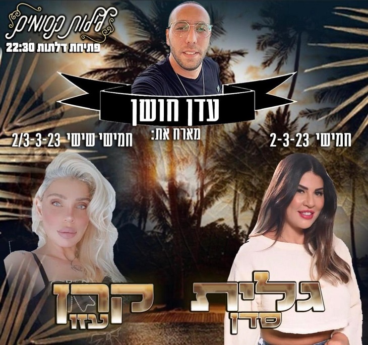 עדן חושן מארח את גלית סדן וקרן עזו. חמישי-שישי, 3-2.3, פתיחת דלתות: 22:30, לילות קסומים, דרך הים 7, אילת