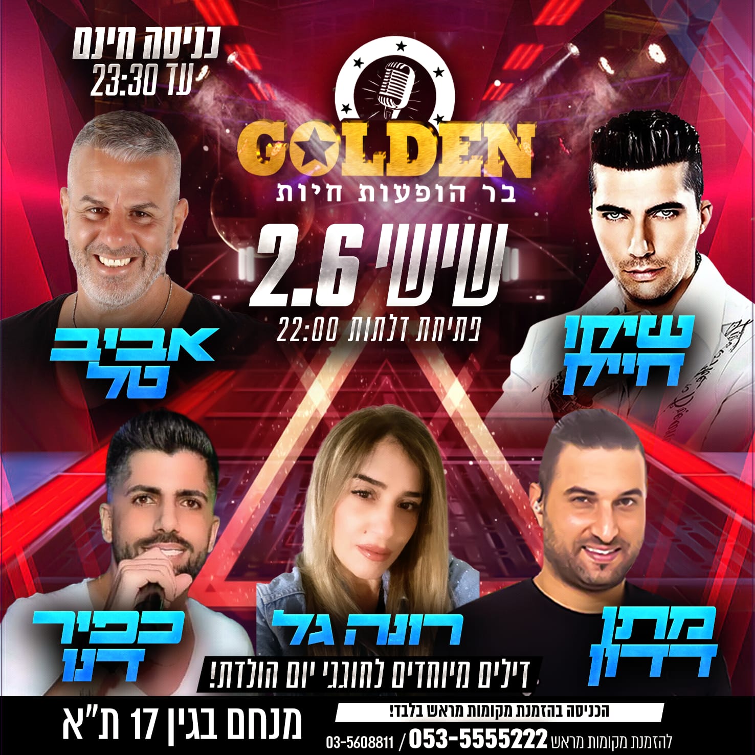 שיקו חייק, אביב טל, מתן דדון, רונה גל, כפיר דנו. שישי, 2.6, פתיחת דלתות: 22:00. גולדן, מנחם בגין 17, ת"א